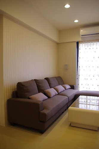 沙發背牆,設計師選用了略帶奢華感的直條紋壁紙,搭配素雅的布質沙發