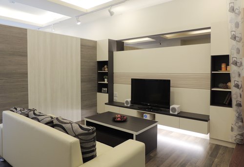 客廳的部份~電視牆皆是以系統板材設計而成,米色系木紋搭配出深色的板材素材~