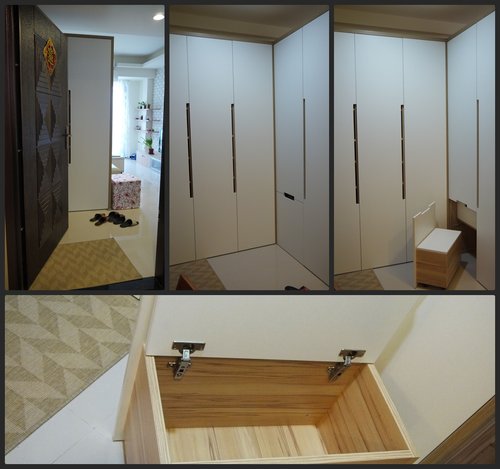 玄關設計師規畫了大量的收納空間,能收納一家人的鞋子及其它物品的擺放,還貼心的規劃一個隱藏式的穿鞋椅同時還兼具收納功能,可以放一些小物品,椅子不用時能推回預留的地方,這樣就不會占空間。