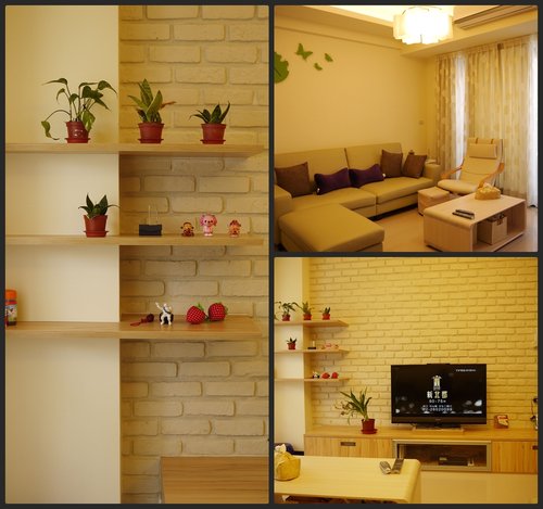 客廳電視牆以文化石做造型,整體顏色都統一用淡色系,感覺上也比較溫馨,在連接柱子的地方規劃一小塊展示空間。