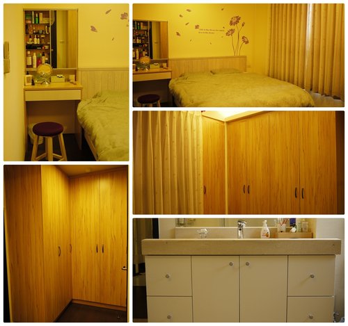 餐廳在柱子與牆面剛好有一塊空間能規劃做收納櫃,將櫃子的深度訂在剛好能跟柱子齊,使整體感比較和諧。 書房為了讓業主能同時擺放兩台電腦使用,規劃一字型的書桌,因為空間的關係,書桌後方的牆面做收納櫃使用,使櫃子與書桌的距離不寬,設計師建議業主將長時間使用的桌上型電腦擺放在靠牆的那一側,讓使用時間較短的座外側以方便出入。 臥室以溫馨的淡色系及能容納大量衣物的衣櫃做規劃,在床頭的牆面搭配上壁貼,讓整體感覺不會太單調。